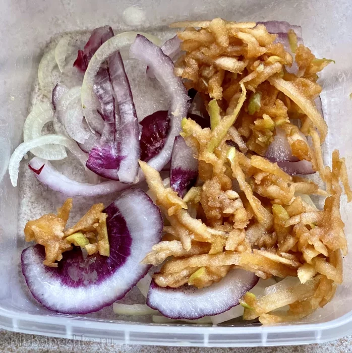 ... и селедку. Залил соусом. И опять – лук, яблоко, селедка, соус. Сверху желательно слой лука и залить соусом, чтобы было, что называется «с верхом».