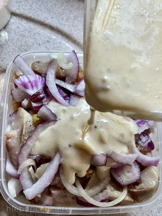 И залить соусом. Чтобы просто покрыть лук и селедку.