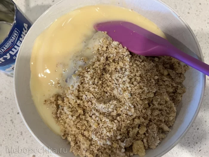 Тем временем готовим начинку: измельчаем орехи и смешиваем их со сгущенкой.