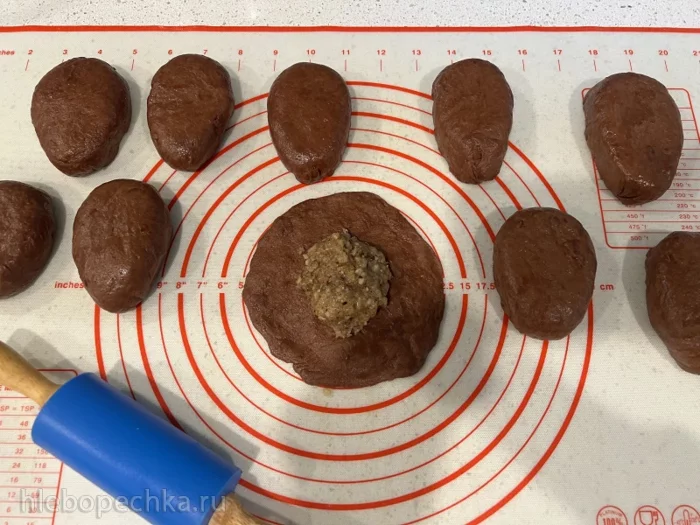 Теперь каждый шарик раскатываем в лепешечку, в центр которой кладем по столовой ложке с верхом начинки. Края лепешки скрепляем, переворачиваем заготовку вниз швом и придаем ей форму будущей шишки.