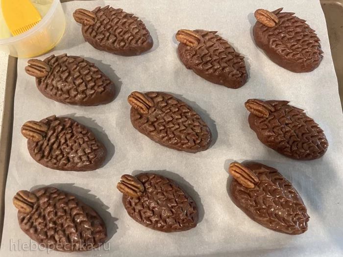 Укладываем будущие шишки на противень, аккуратно смазываем их белком и прикрепляем на верхушку половинку грецкого ореха. Выпекать на 170 градусах тридцать минут.