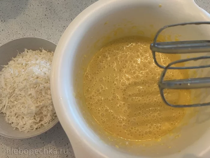 Масло комнатной температуры взбить до белизны, постепенно, по одному, добавляя яйца. Влить сгущенку и в последнюю очередь добавить кокосовую стружку.