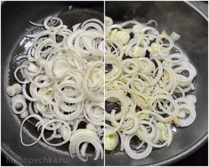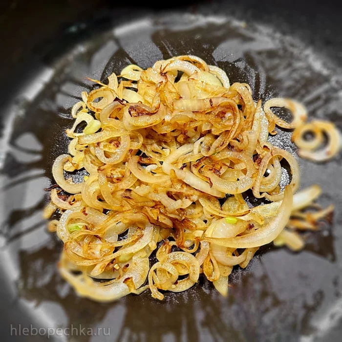 Постоянно помешивая, на нагреве «выше среднего ближе к максимальному» карамелизировал лук пять минут.