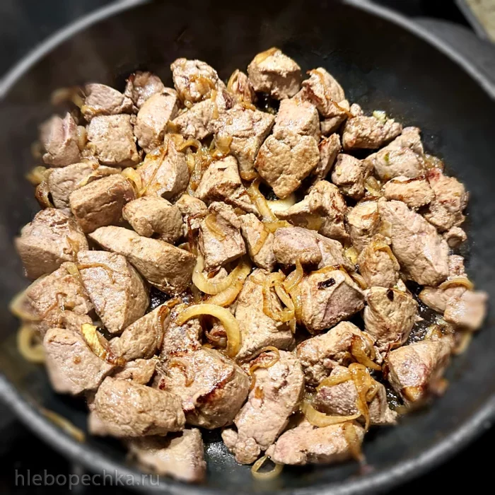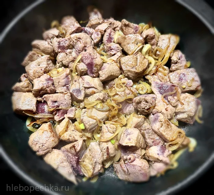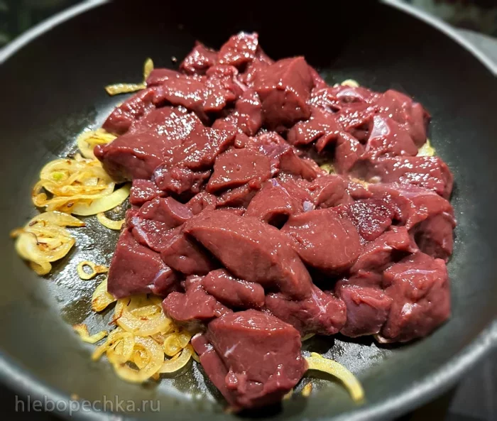 Печёнку к луку.