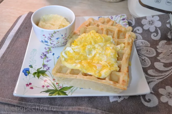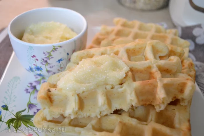 Из готового теста выпекать вафли в электровафельнице, режим «бельгийские вафли». Время выпечки примерно 4 минуты.