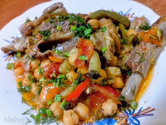 Сухой нут замочить с вечера (автор советует в холодную воду добавить по 0,5 ч. л соды и соли, но я этого никогда не делаю: нут свежий, прекрасно разбухает и просто в воде без добавок), утром автор советует сварить почти до готовности (я не варю, потому что нут далее будет долго тушиться с мясом и овощами и успеет прекрасно приготовиться). Можно использовать консервированный нут.
