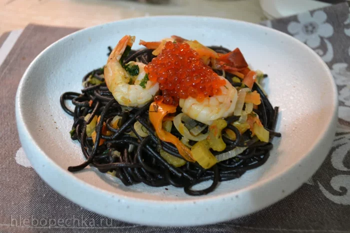 Для пасты использовала спагетти из муки твердых сортов с добавлением чернил каракатицы. Такую пасту можно приготовить в домашних условиях, также добавив при замесе теста чернила каракатицы.
