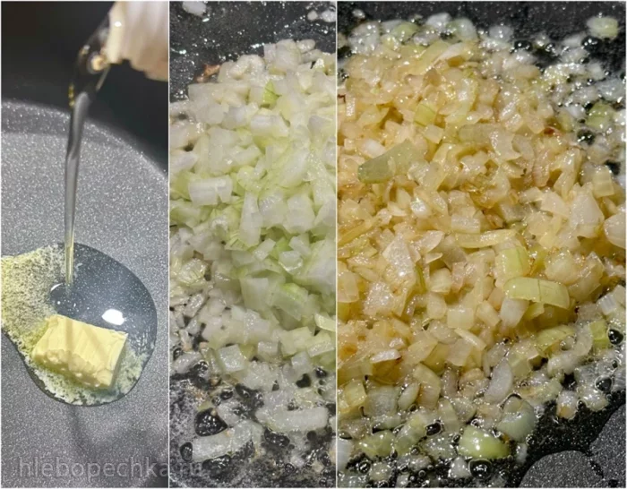 Сначала луковку нарубил некрупно и на смеси растительного и сливочного масла лук этот умягчил, зазолотил слегка.