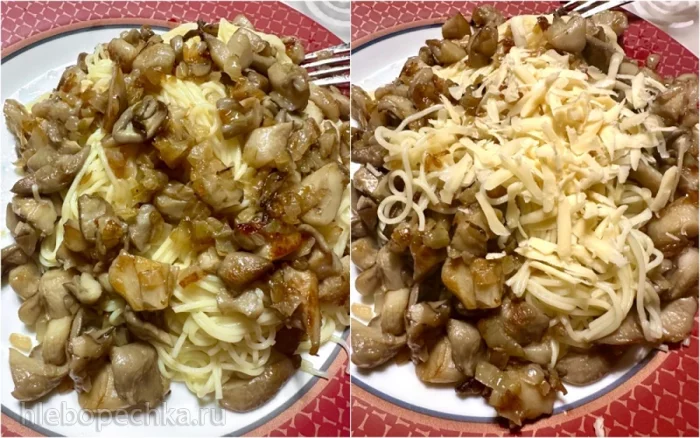 Макароны к тому времени сварились. Я их не промывал. Просто выложил поверх них грибы.