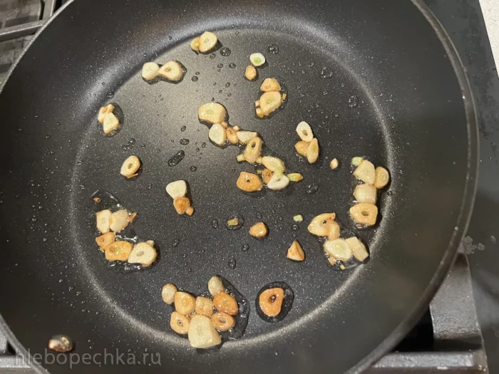 Зубчики чеснока нарезать пластинками и слегка обжарить.