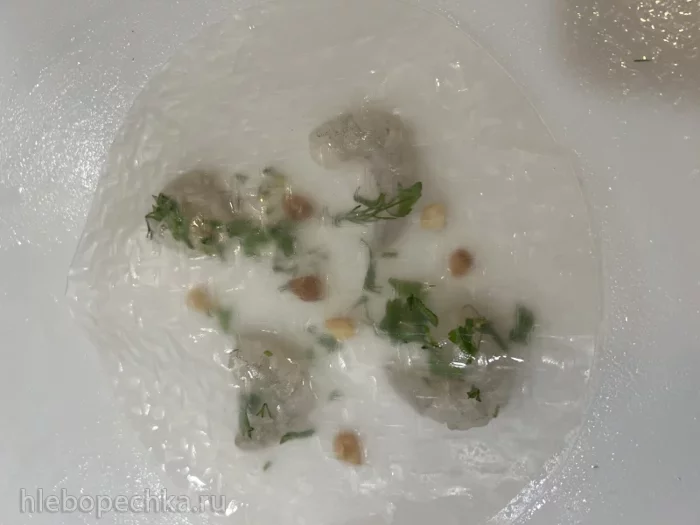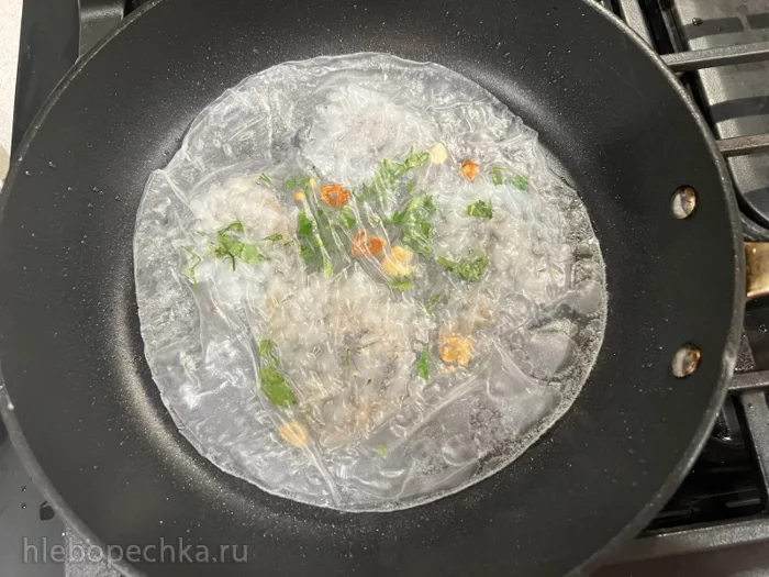 Один лист рисовой бумаги ополоснуть водой прямо из-под крана, разложить на нем 4-5 размороженных сырых креветок, посыпать обжаренным чесноком, нарезанной зеленью, слегка посолить и накрыть вторым, также смоченным листом бумаги.