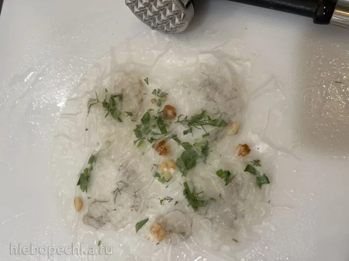 Плотно прижать верхний лист и «притрамбовать» его к нижнему кулинарным молотком, равномерно расплющивая креветки