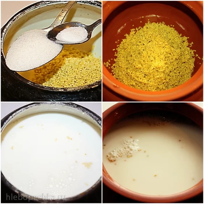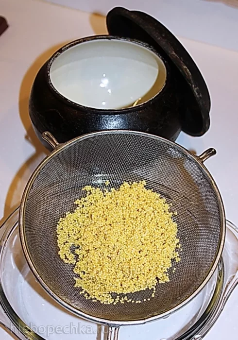 Высыпали пшено в чугунок, кстати, хороший глиняный горшок вполне чугунок может заменить. Ложку сахара, да соли пол чайной ложки.