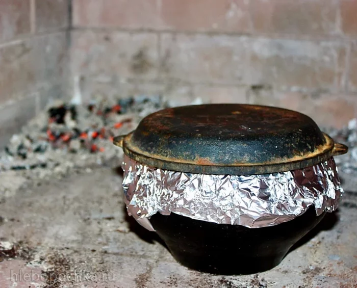 Крышкой накрыли. И в печку. Угольки (они уже прогорели практически) отодвинули подальше, чугунок ближе к заслонке поставили. Чтобы, значит, не подгорело.