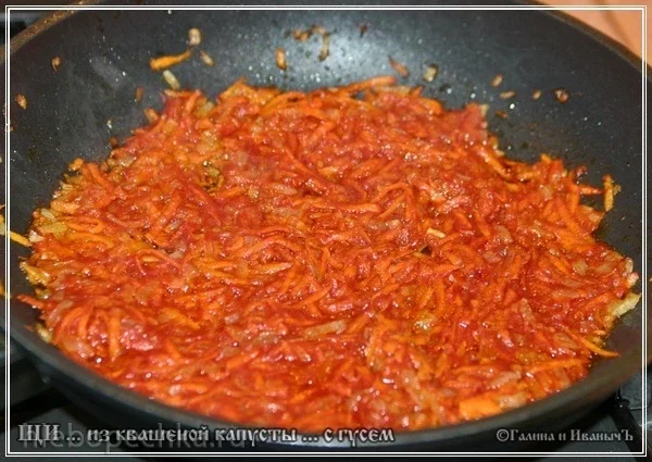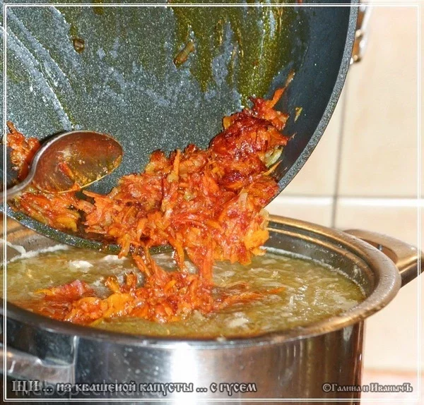 Потом закладываем зажарку - заправку в кастрюлю. Хорошо перемешиваем.