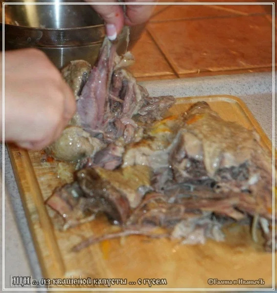 Гуся разделываем. Кости, чтобы отдельно, а мясо, нарезая, отдельно. Нарезать надо так, чтобы кусочки на ложку удобно вмещались и в рот влезали.