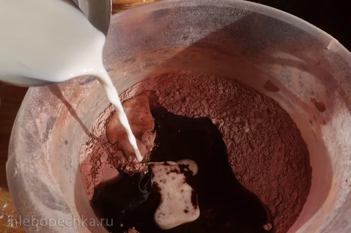 В чаше смешать муку, какао, соду, разрыхлитель. Влить масло и молоко.