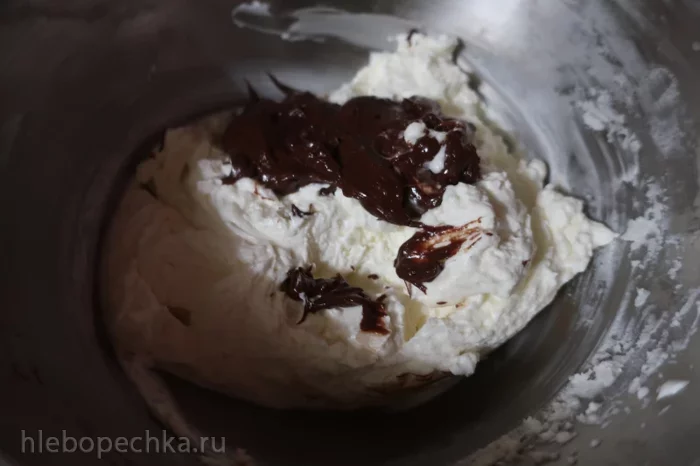 Для крема шоколад растопить. Сливки, творожный сыр и сахарную пудру взбить до пышности. Крем разделить на две части. В одну часть ввести шоколад-перемешать.