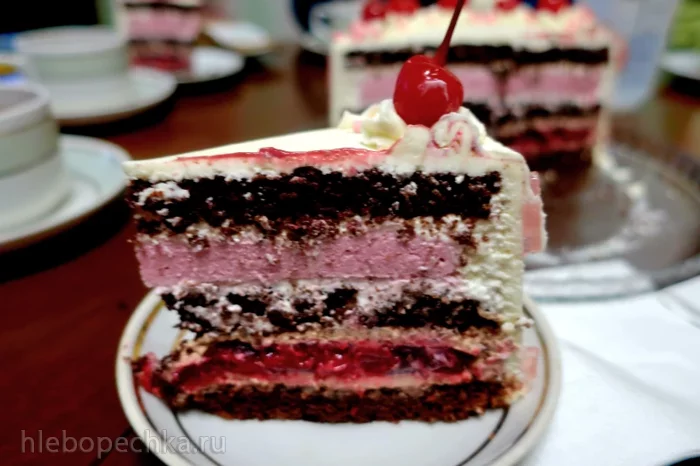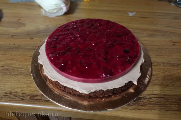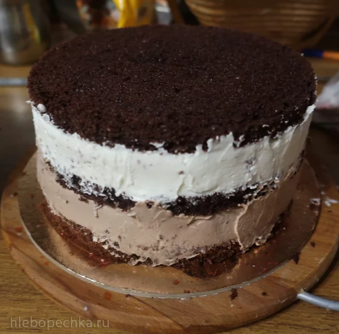 Потом положить второй корж. Пропитать сиропом. Смазать белым кремом. Положить муссовую прослойку и по бокам и сверху крем. Накрыть третьим коржом. Пропитать сиропом. Убрать в форму и накрыть пленкой. Оставить в холоде на несколько часов.