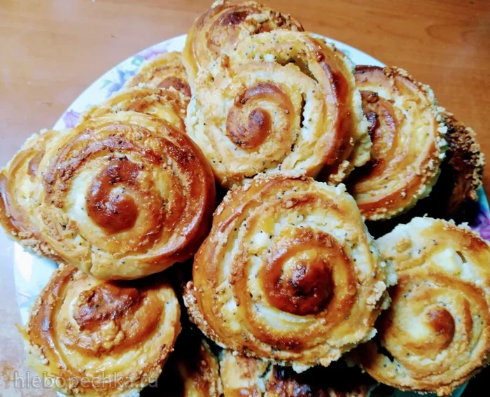 Раскатать тесто в тонкий пласт, смазать мягким сливочным маслом и равномерно рассыпать творог и мак.