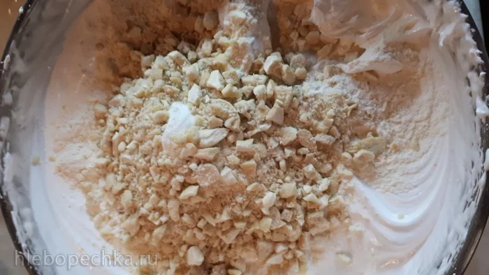 Когда белки взобьются, добавить к ним просеянную муку и большую часть орехов.