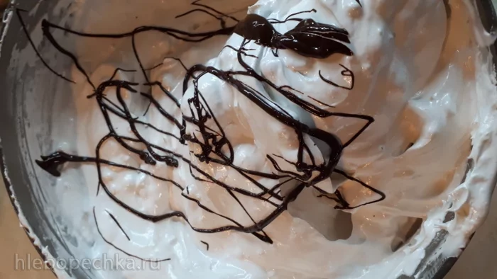 Слегка теплый растопленный шоколад паутинкой распределяем по поверхности белковой смеси.