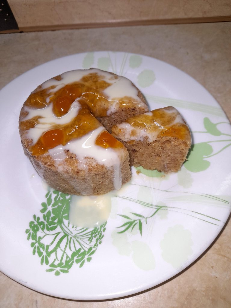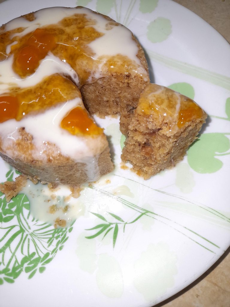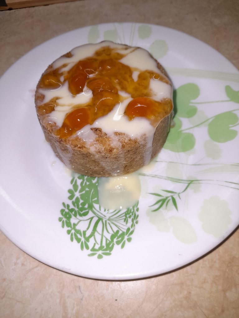 5 минут даем постоять в форме, чтобы пудинг отошел от стенок формы. Я еще и лопаточкой немного отодвинула. Накрываем форму тарелкой и переворачиваем. Если форма была смазана хорошо, то пудинг вывалится сразу. Если – нет, то можно тихонечко постучать по дну, чтобы он вывалился на тарелку. Я сверху полила сгущенкой и джемом.