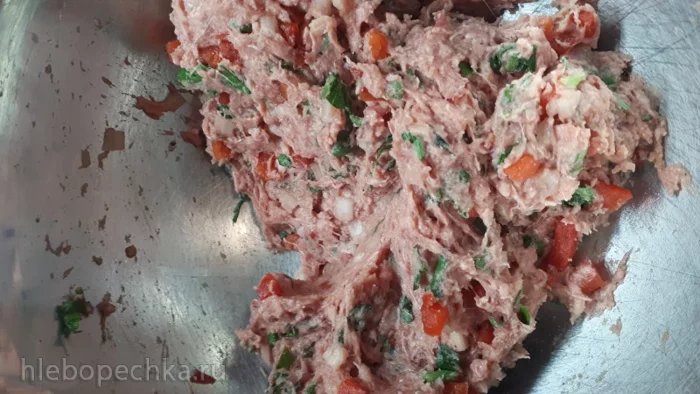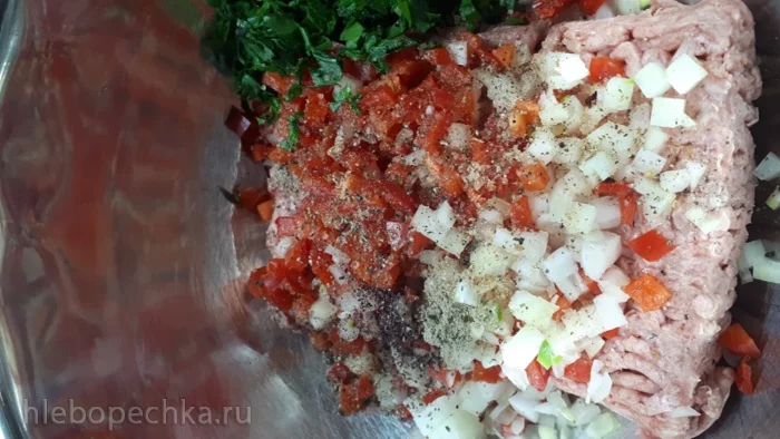 В фарш (у меня говяжий магазинный) добавила мелко порезанный лук, болгарский перец, соль, приправы и хорошо перемешала.