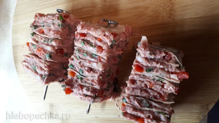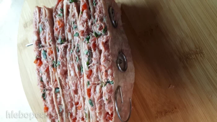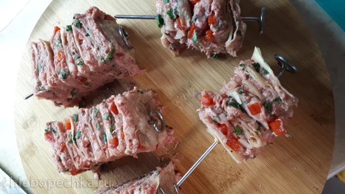 Сделала наметки на 3 части и в каждую из частей воткнула шампур для аэрогриля.