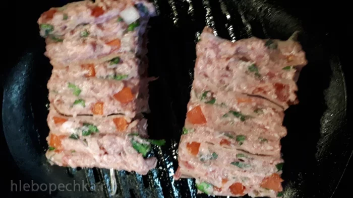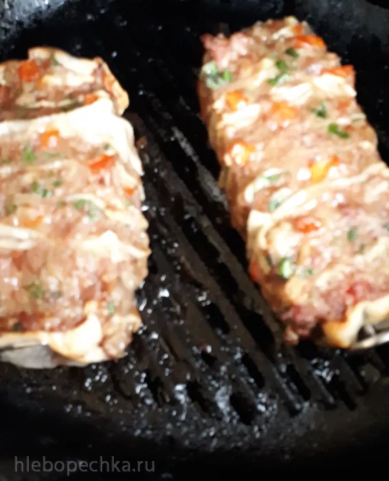 Можно при готовке смазать чесночным маслом. У меня фарш был жирноват, поэтому ничем не смазывала.