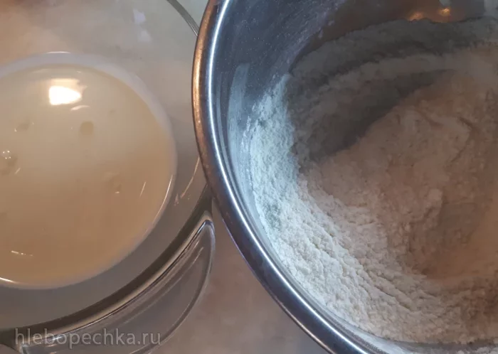 В одной миске смешиваем сухие ингредиенты (мука, разрыхлитель, сахар, соль), в другой – жидкие (молоко, горячая вода, растительное масло).