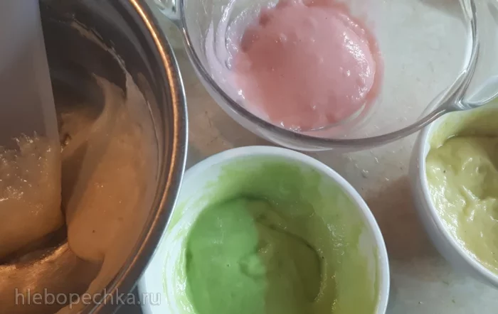 Чтобы сделать цветные кексы, нужно тесто разделить на желаемое количество цветов. Я разделила на 4. Добавила по капле пищевого красителя: розовый, желтый, зеленый и оставила белый.