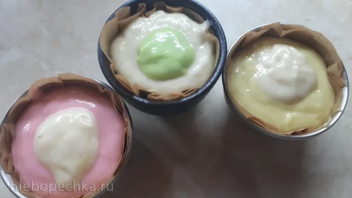 Для разноцветных кексов по очереди ложкой выкладываем тесто разных цветов почти до края формы.