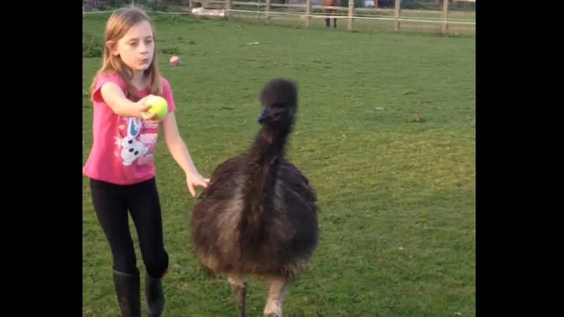 Девочка играет со страусом в мяч. И что же он делает когда не может этот мяч поднять