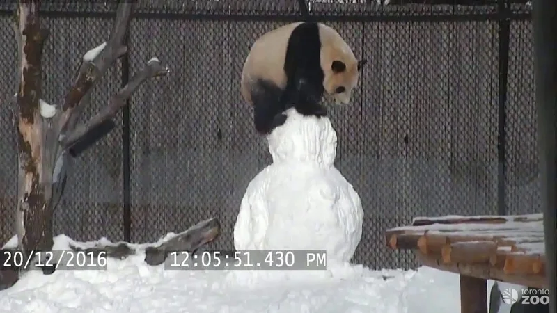 Панда играет со снеговиком